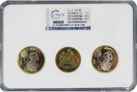 CNCS推出最新“馬上封侯”生肖評級幣套裝啦,此次評級的套裝“馬上封侯”由一枚馬年生肖紀念幣和兩枚猴年生肖紀念幣組成,組合新穎,寓意深刻。此次CNCS推出的“馬上封侯”的生肖評級套裝,是由一枚馬年生肖紀念幣(一輪)和兩枚猴年生肖紀念幣(二輪)組成。排列順序是馬年生肖紀念幣在中間,兩枚猴年生肖紀念幣(二輪)在兩側(cè)。