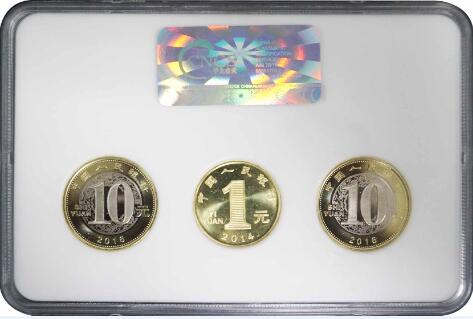 由一枚馬年生肖紀念幣(一輪)和兩枚猴年生肖紀念幣(二輪)組成。排列順序是馬年生肖紀念幣在中間,兩枚猴年生肖紀念幣(二輪)在兩側(cè)。